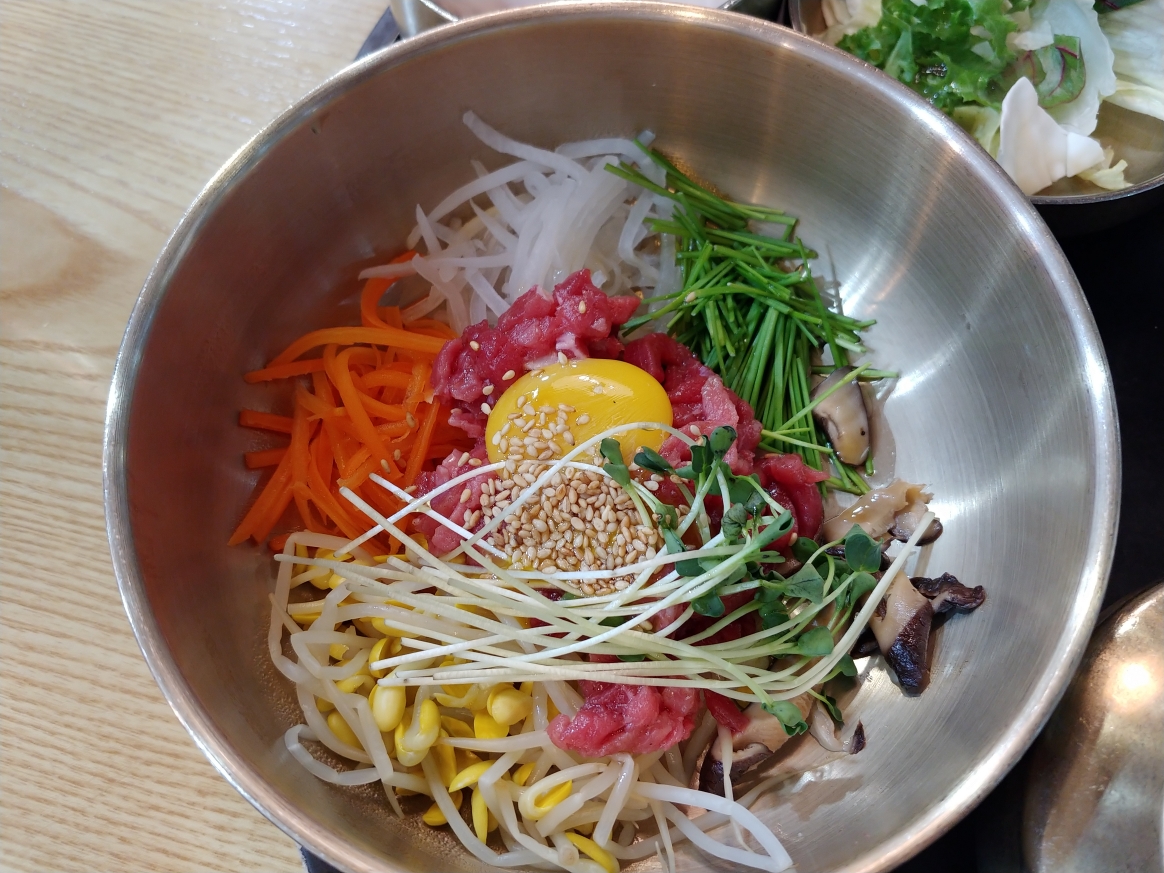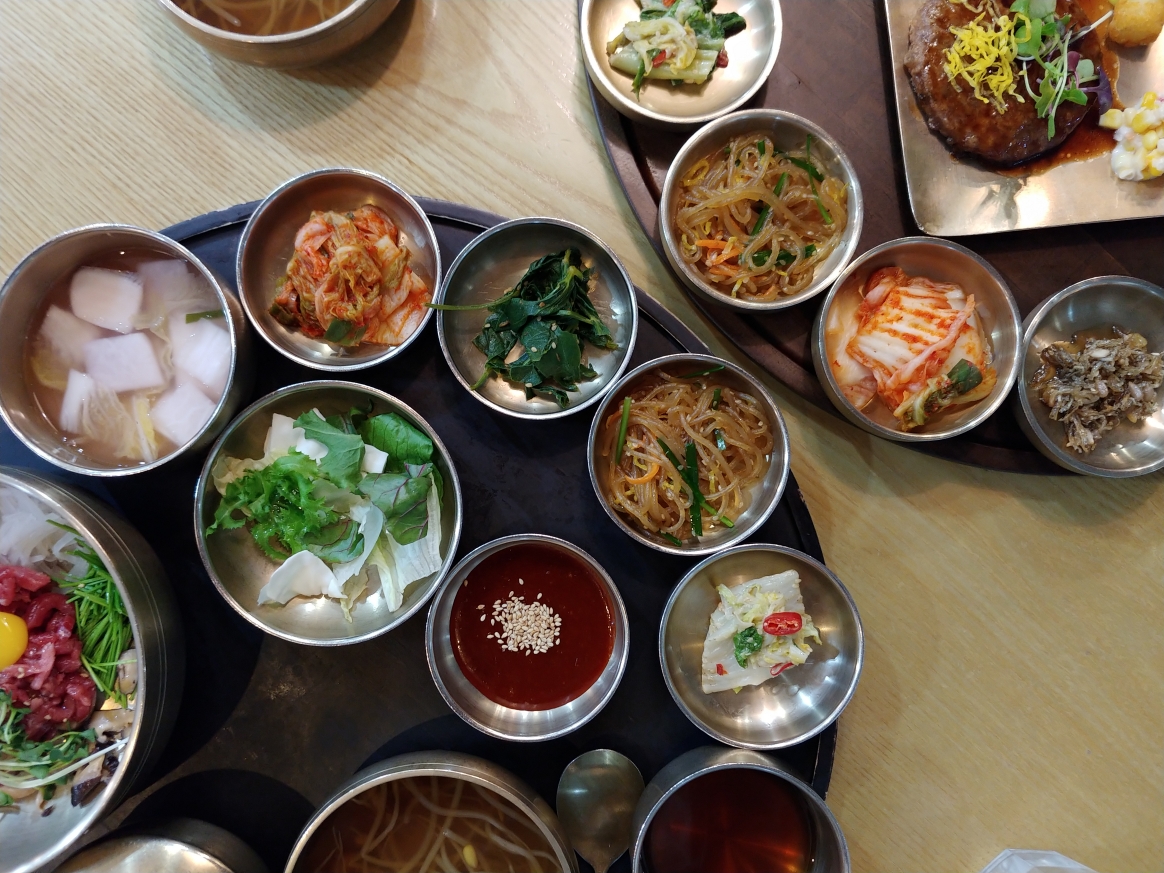 아이가 먹고 싶은 메뉴를 정하는데, 어린이메뉴가 있어서 그런지 여기 식당을 정했고, 가족들도 모두 따라서 입장했습니다. 뭐 어째든 먹기 싫은 메뉴도 아니고 단지 그냥 익숙한 한식이다보니 사람들이 많이 없는 것 같습니다. 어째든 자리를 안내 받아서 메뉴를 보고 골동비빔밥, 육회비빔밥, 어린이 떡갈비 한상 메뉴를 주문했고, 한상에는 채소 반찬과 국, 잡채 등이 같이 나왔습니다. 어린이 메뉴 역시 동일한 반찬으로 구성되어 나왔고 메뉴의 특성상 아이와 동반 식사 장소로 나쁘지 않습니다. 입장 전에 식당 입구에 메뉴판이 있기 때문에 대략적인 메뉴와 가격대를 확인할 수 있습니다. 뭐 네이버나 다음에 검색하면 메뉴가 거의 다 나옵니다만, 메뉴판에 보이는 그림와 동일하게 나오지는 않기 때문에 아래의 이미지 참고 바랍니다.
